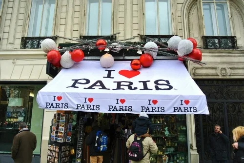 A street side store on Avenue des Champs-Élysées in Paris, spreading the love for the city